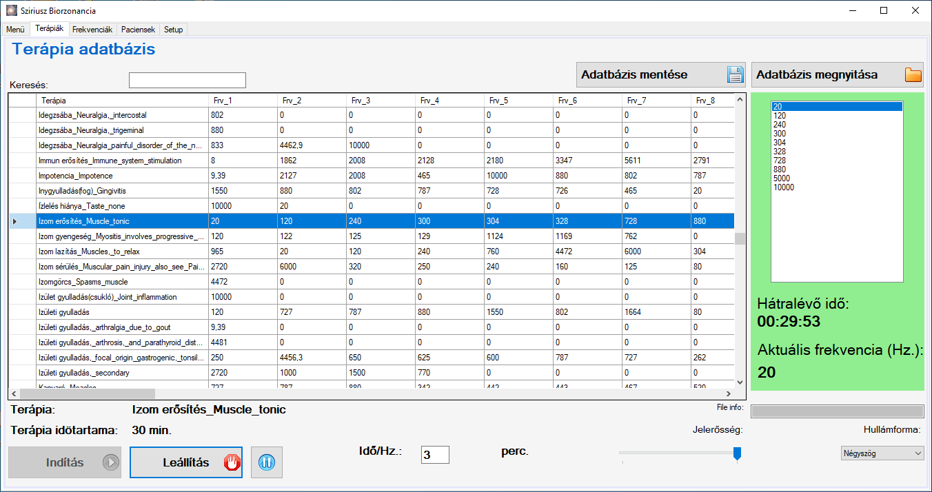 Ezen az oldalon található a frekvencia adatbázis ami Dr.Rife frekvencia sorokat tartalmazza (CAFL adatbázis). A listában található terápiák kiválasztását a táblázat görgetésével vagy a fenti keresőmezőben beírva tudja elvégezni. A kiválasztott terápiát a sorra való klikkélessel lehet kiválasztani. Ilyenkor a terápiákhoz tartozó frekvenciák a jobb oldali listában láthatók, a kezelés időtartama az oldal alján látható. Ezután a kezelés az “Indítás” gomb megnyomásával indítható. A jobb oldali ablakban látható az aktuálisan generált frekvencia és a kezelésből hátralévő idő. A visszaszámláló lejártakor a kezelés leáll. Az adatbázis a táblázaton keresztül szerkeszthető, további sor hozzáadható. A módosítás a “Adatbázis mentése” gombbal véglegesíthető. Lehetőség van más forrásból származó adatbázis fájl megnyitására, feltétel a szabványos csv fájl formátum.