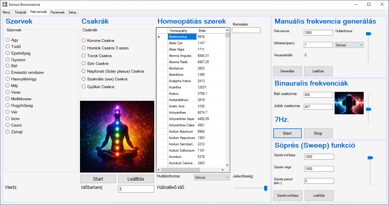 A frekvenciák oldalon a rezgések visszaállítására és manuálisan megadott frekvenciák generálására van lehetőség. A Szervek/csakrák/Homeopátiás szerek ablakban a jelölő gombok kiválasztásával vagy a táblázat sorára kattintva tudja kiválasztani a kívánt opciót. Ilyenkor a kiválasztott kép látható. A “Start” gomb megnyomásával indítható a frekvencia generálás, ami az időtartam ablakban megadott ideig fog tartani. A jobb oldali ablakokban manuálisan megadott frekvencia, Binaurális hangok generálása, valamint két megadott frekvencia érték közötti “söprés” végezhető el.
