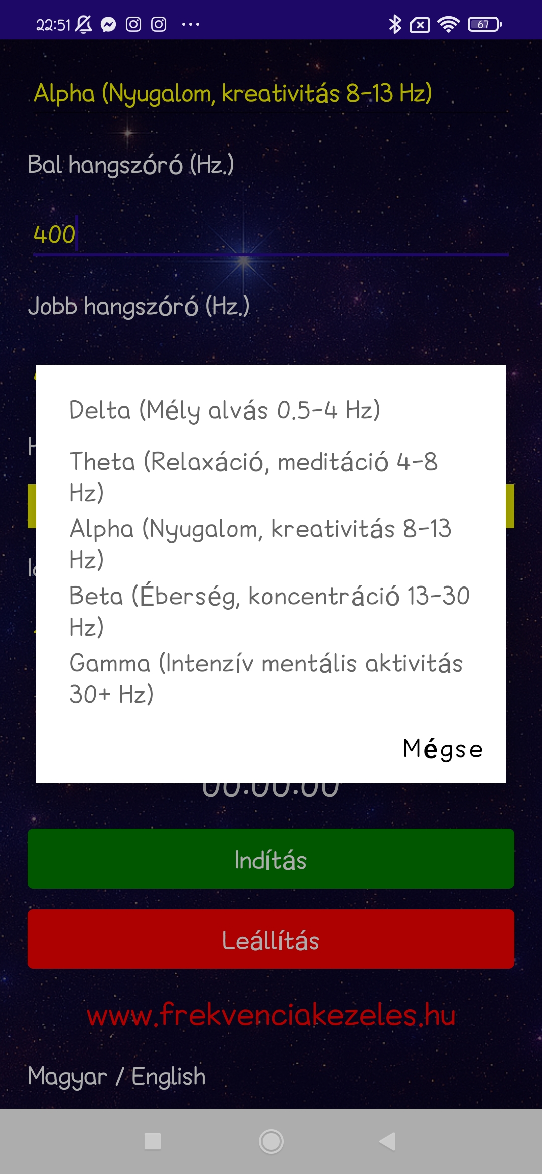 Binaurális frekvenciák generálásának lehetősége a Biofeedback szoftververzióban.