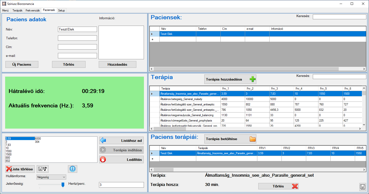 Ezen az oldalon felvehetünk pácienseket, akikhez személyre szabott frekvencia sorokat adhatunk hozzá. Egyedi frekvencia fájl megnyitására is van lehetőség, ami a program által testelemzést követően jön létre vagy akár külső forrásból is származhat. A megnyitandó fájlnak megfelelő “csv” formátumban kell lennie (Név; Terápia neve; Frekvencia értékek;....) Az összeállított frekvencia sorokat egyesével vagy akár egymás után is futtathatjuk.
