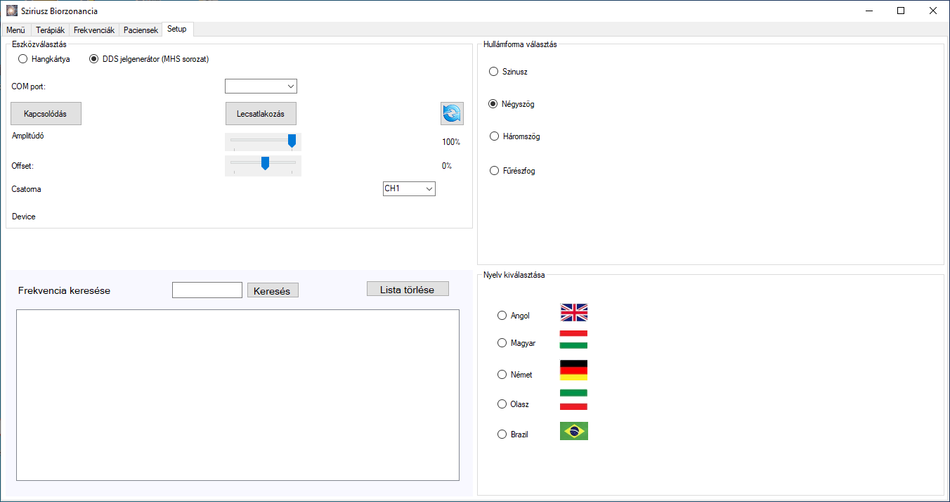 Frekvencia generálásra használt eszköz kiválasztása, hangkártya vagy MHS DDS box. Hullámorma beállítása. Nyelv kiválasztása. Frekvenciához tartozó kezelések keresése az adatbázisban.